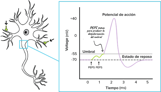 El potencial umbral se produce cuando el número de iones sodio que entran en la fibra supera al número de iones potasio que salen. Habitualmente es necesario un aumento súbito del potencial de membrana de 15 a 30 mV. Por tanto, un aumento súbito del potencial de membrana en una fibra nerviosa grande desde –90 mV hasta aproximadamente –65 mV suele dar lugar a la aparición explosiva de un potencial de acción. Se dice que este nivel de –65 mV es el umbral para la estimulación.