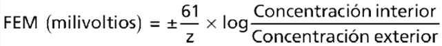 La ecuación de Nernst describe la relación del potencial de difusión con la diferencia de concentración de iones a través de una membrana: